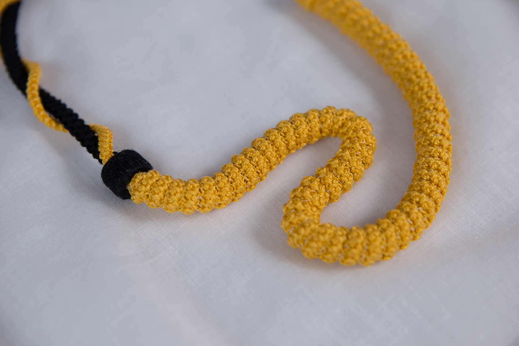 Eldöntendő kérdés: a fekete zsinór kúszik át a sárga zsinórból felépülő kanyargós alagúton vagy a sárga tok igyekszik mindenáron behálózni a fekete zsinórt. Mindegy. Gondolkodásra késztető nyakék olyan nőknek, akik szeretnek a tekintetek kereszttűzében létezni.