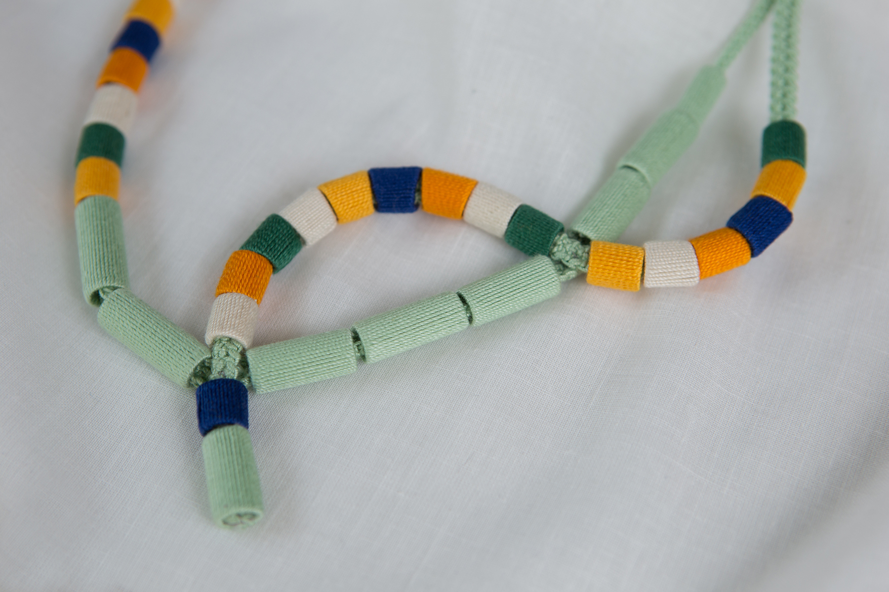 Gondolkodásra késztető munkáim egyik mintapédánya ez az érdekes nyakék. A színes elemekből álló sor kettészakadva lehullni készül. Eltűnődhetünk azon, hogy a pasztellzöld szár képes-e a kármentésre vagy sem.
